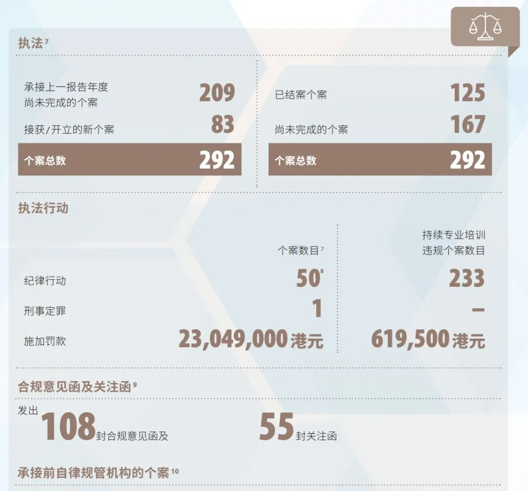 报告期内保监局接收个案292宗(125宗已结案),采取50项纪律行动罚款逾2304万港元,处理233宗持续专业培训违规个案罚款超61万港元。
