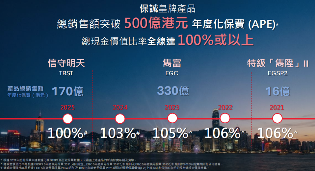 过去5年总销售额突破500亿港元年度化保费(APE),总现金价值比率全线达100%或以上,部分产品高达106%!